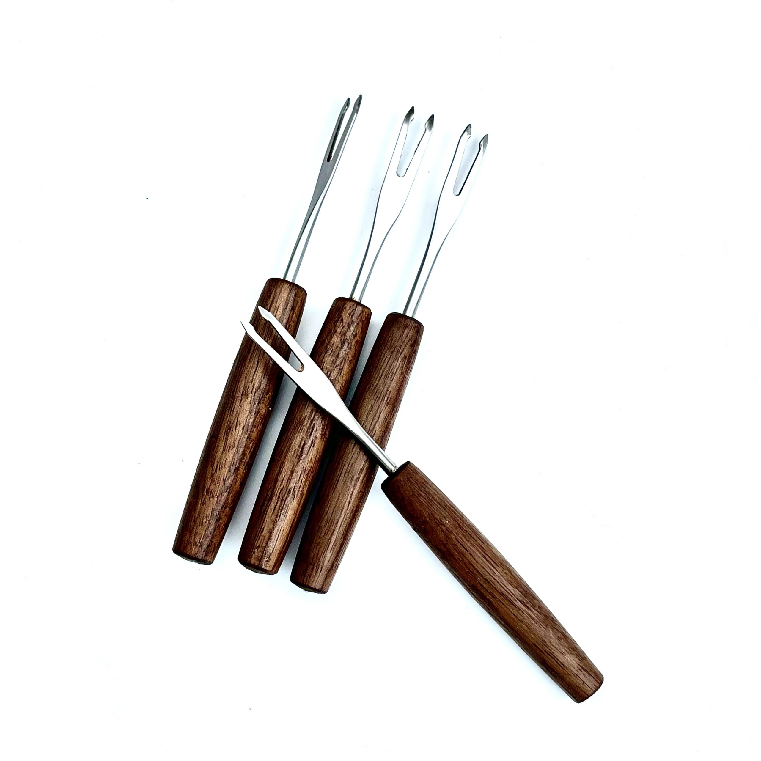 Disse smukke pålægsgafler er håndlavet med skaft i olieret valnøddetræ og en elegant rustfri stålgaffel. De ligger godt i hånden og er det perfekte tilbehør til tapasbordet, ostefadet eller til at fiske oliven og syltede sager op med stil.