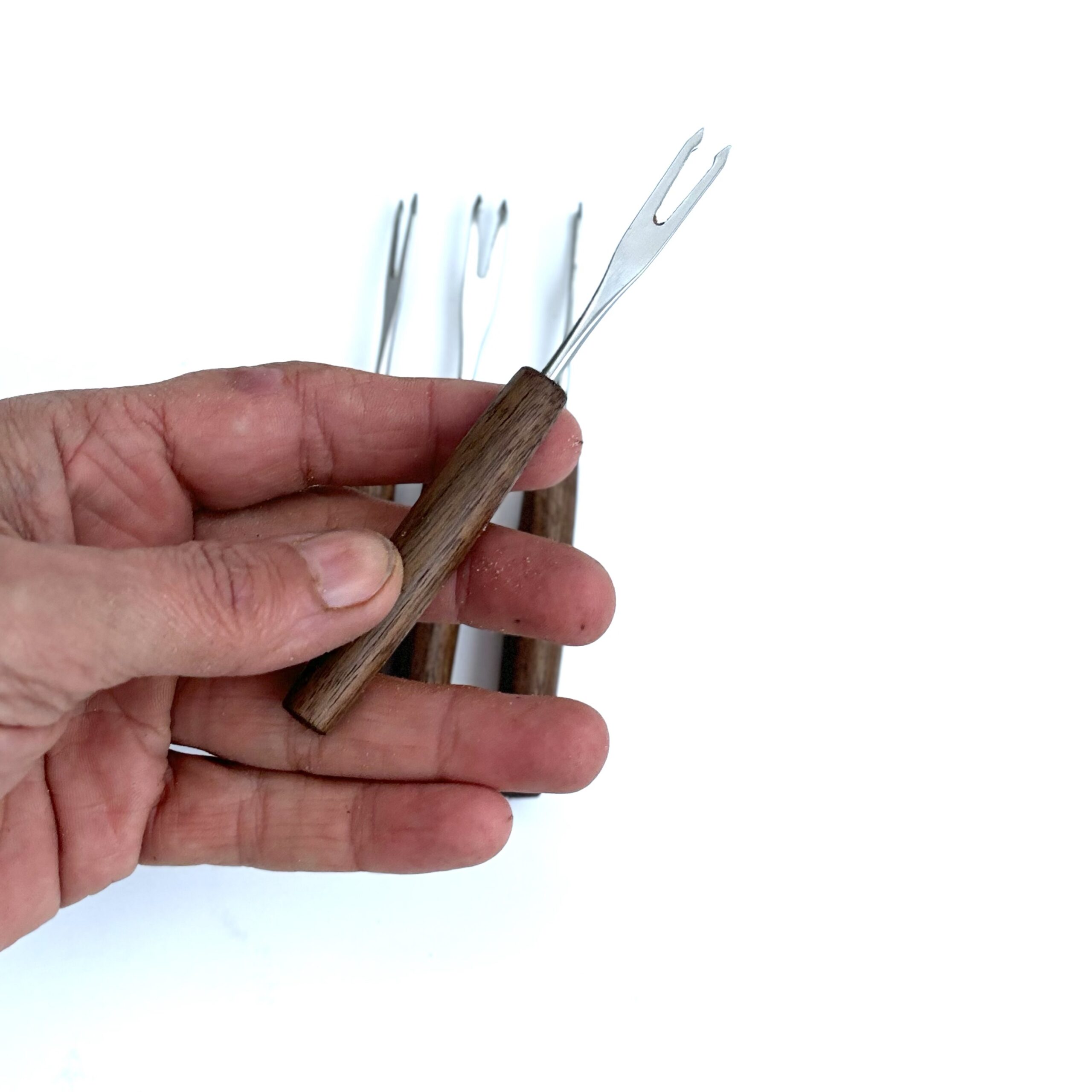 Der er 2 gafler i et sæt til prisen. Gaflerne er ca. 11cm lange. De må bør opvaskes i hånden og tåler ikke iblødsætning og opvaskemaskine. Gaflerne kan variere lidt i størrelse og udtryk da de er håndlavede.