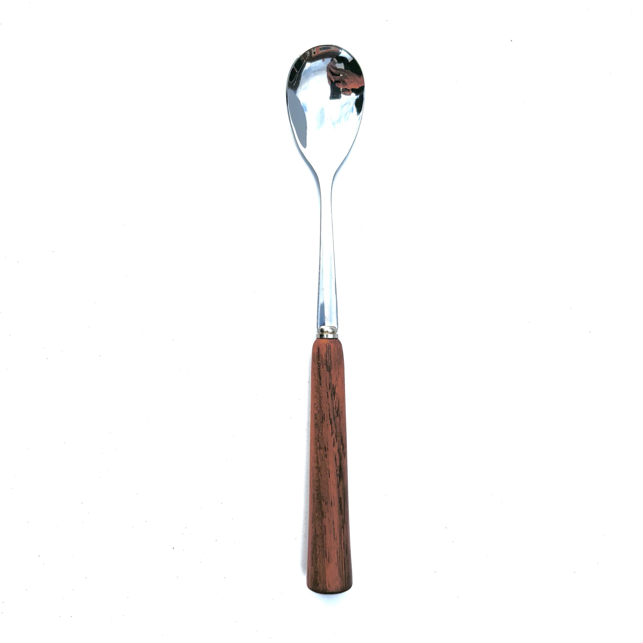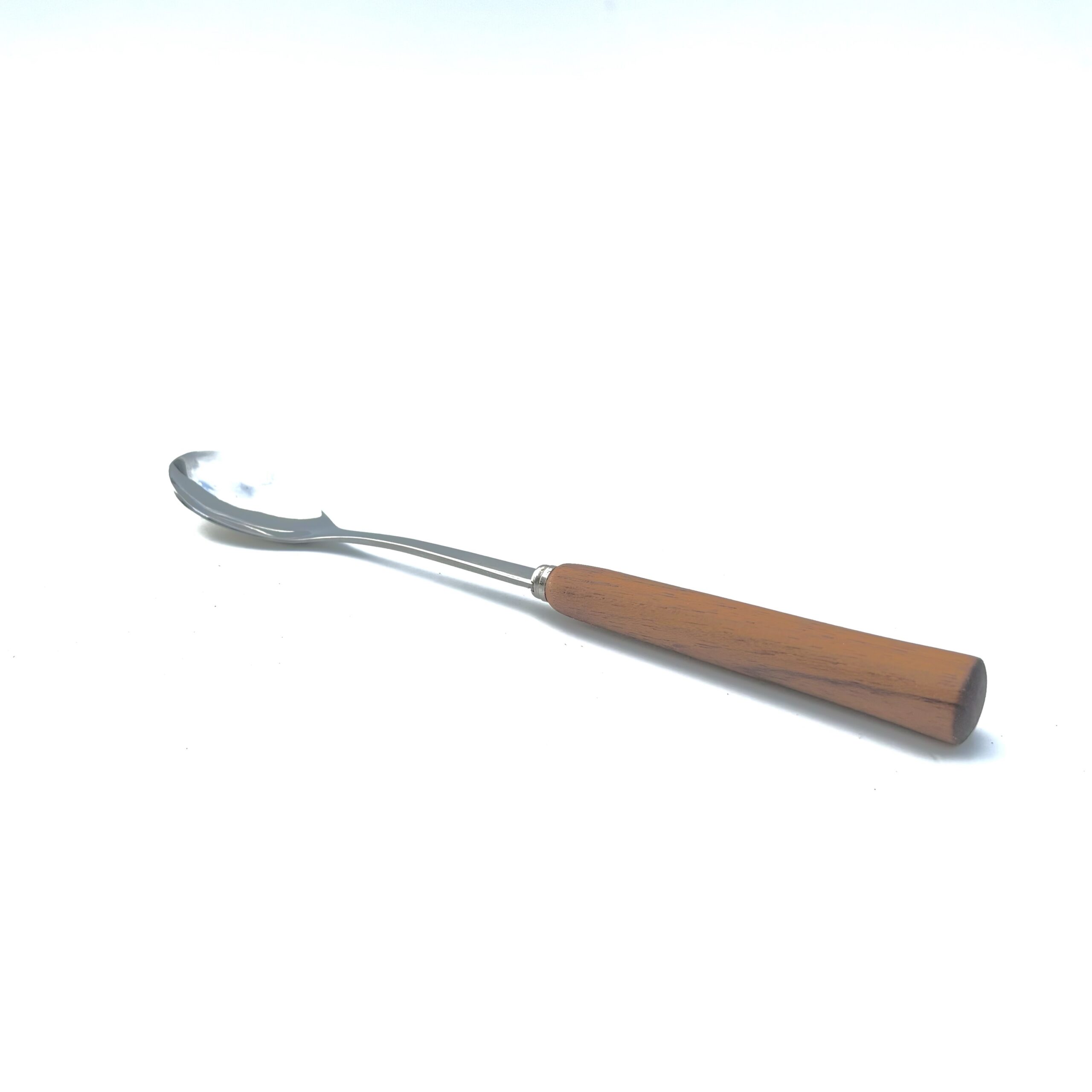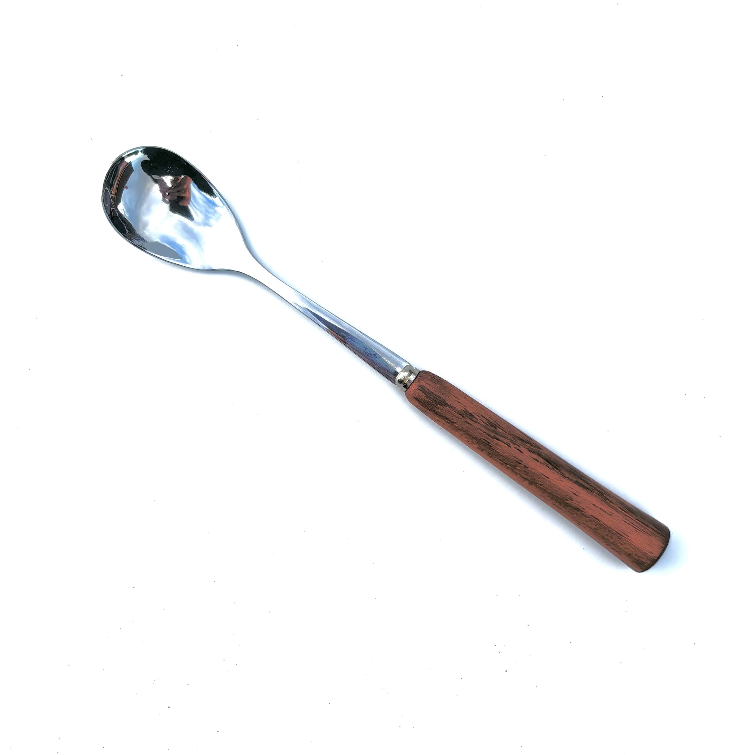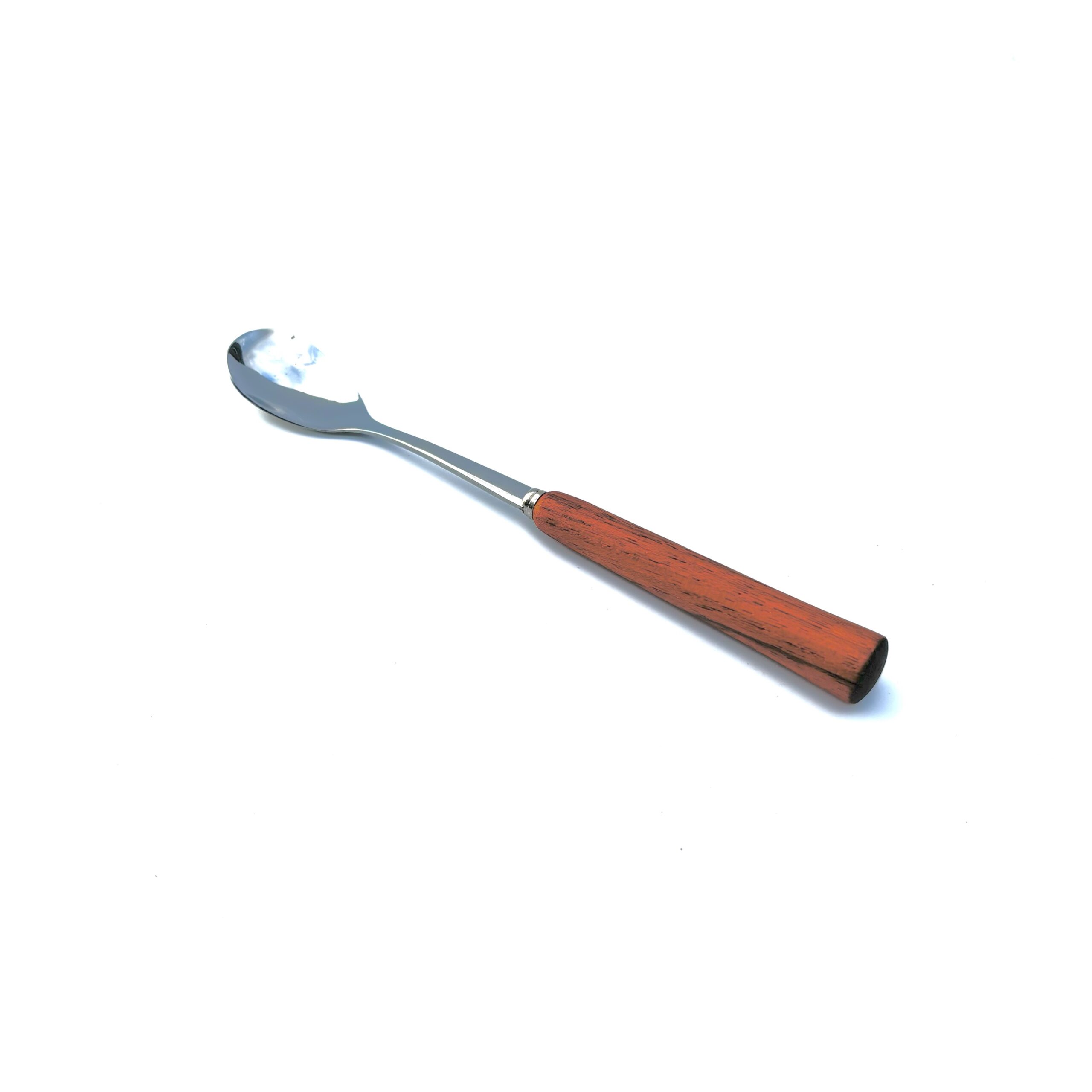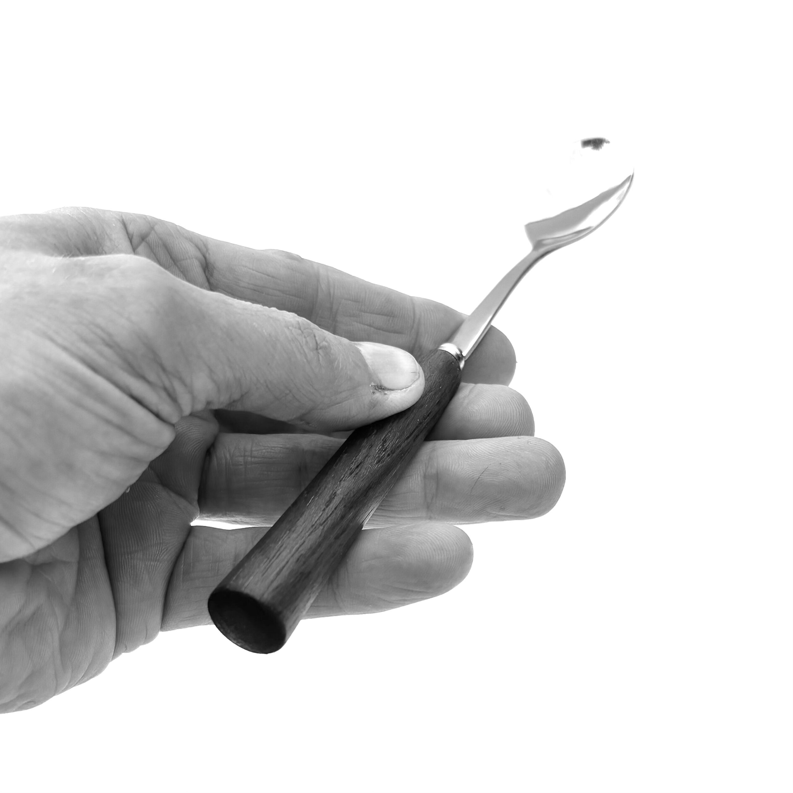 Skeens enkle formsprog i stål står i fin kontrast til teaktræets levende glød og naturlige åretegninger. Hver eneste ske er unik og lavet med fokus på detaljen – perfekt til kaffebordet, tekoppen eller som en lille hverdagsluksus.