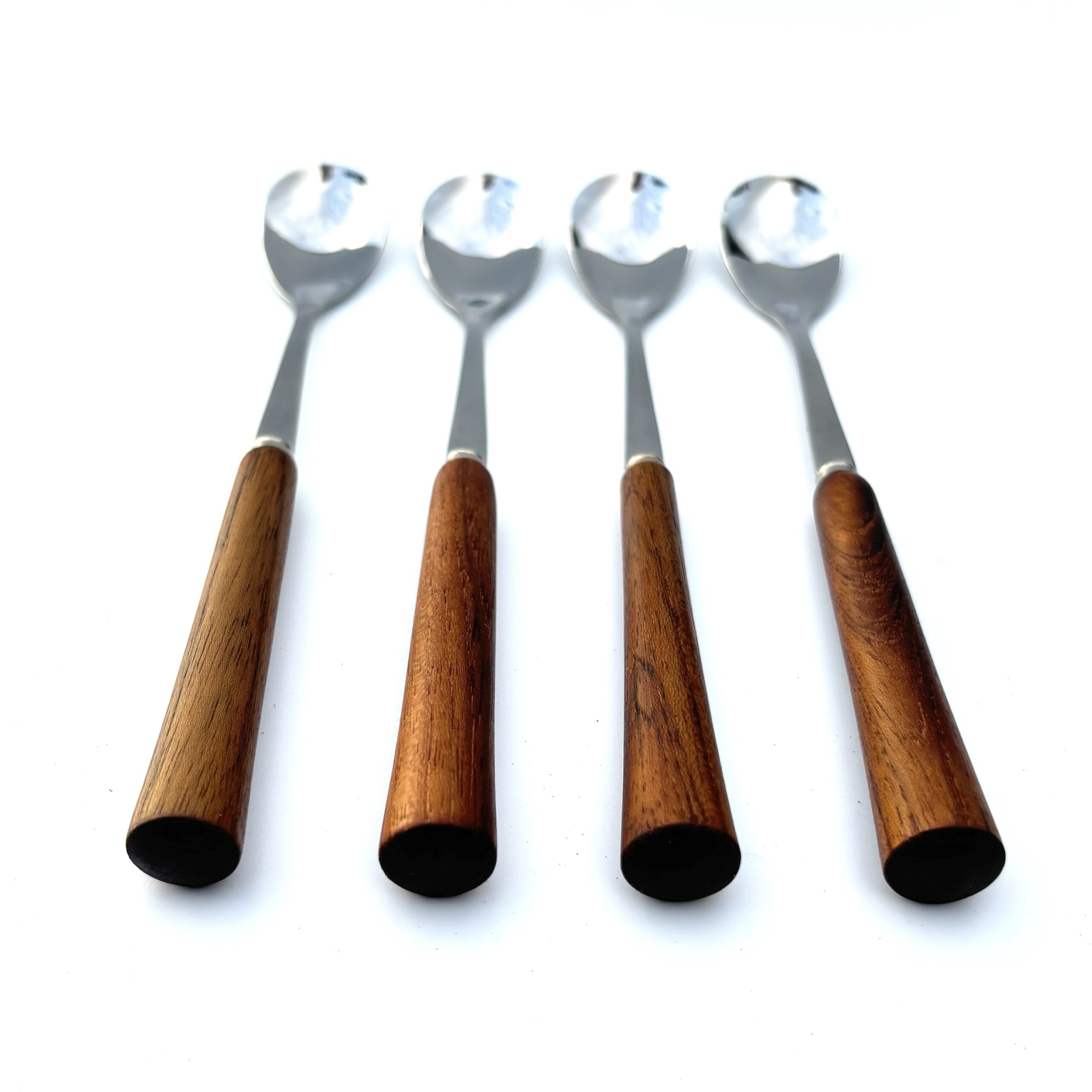 Disse teskeer forener rustfrit stål med smukt, håndbearbejdet teaktræ – et møde mellem funktion og æstetik i det små.