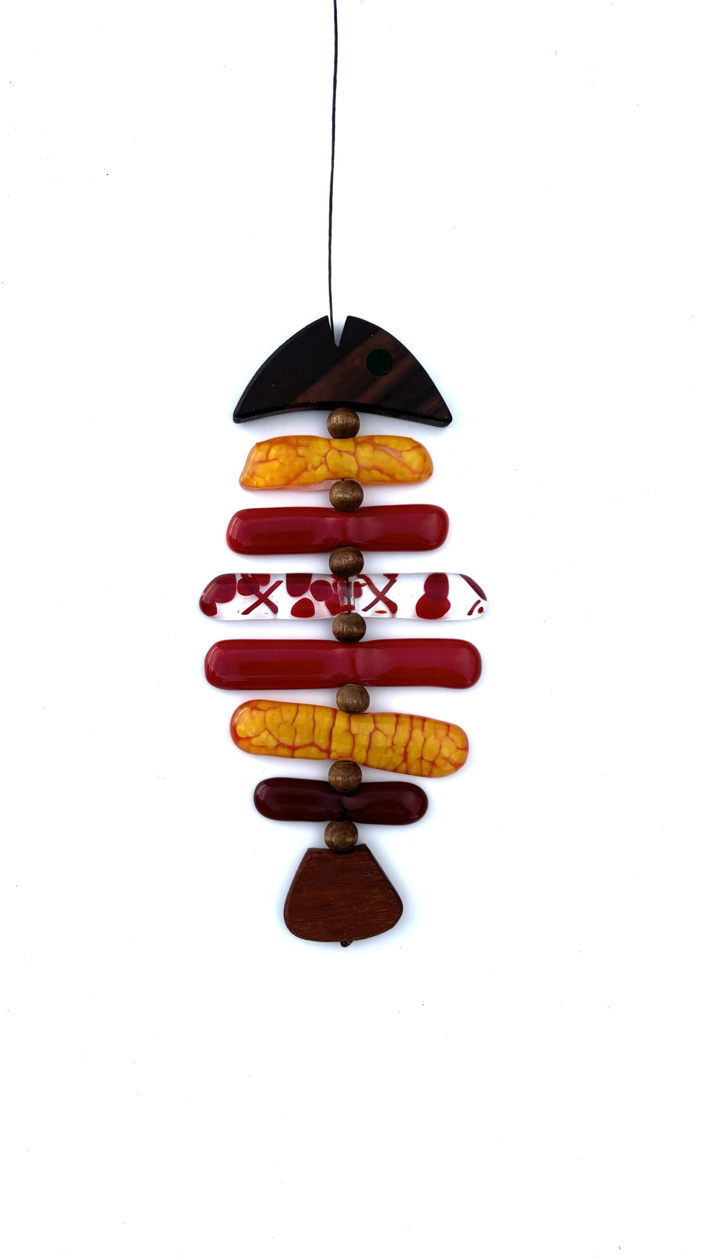 Trædelene er håndskåret i valnød og mahogni, og farvespillet i gule og røde toner gør den levende og varm i udtrykket – især når vinden fanger den eller lyset bryder gennem rummet.